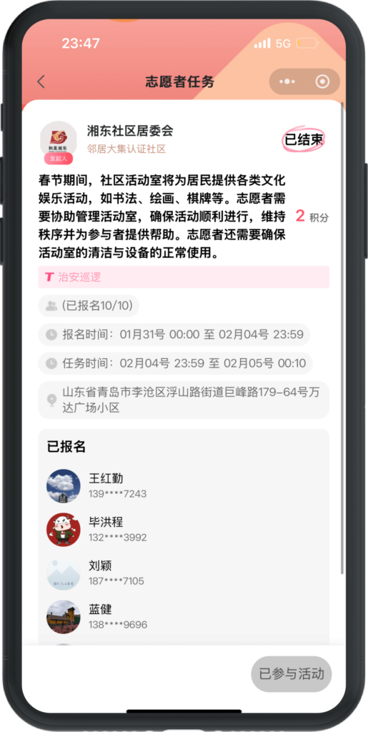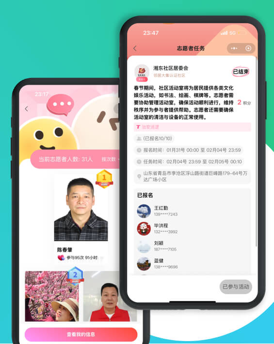 简洁直观的操作界面,一键注册、快速报名,让志愿服务在邻里互动之间、刚需之内触手可及!