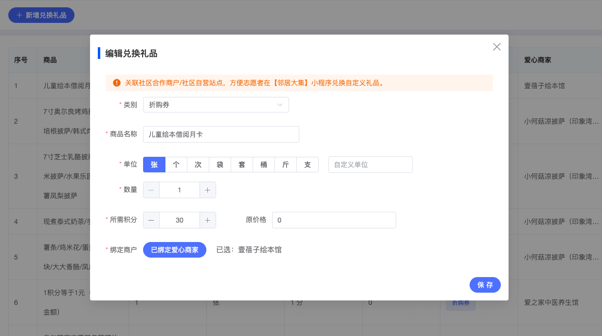社区商户为志愿服务提供物资、优惠或服务支持,让志愿行动更有资源保障,服务更高效!社区为共建商户创造更多与社区和居民联系的渠道和支撑。